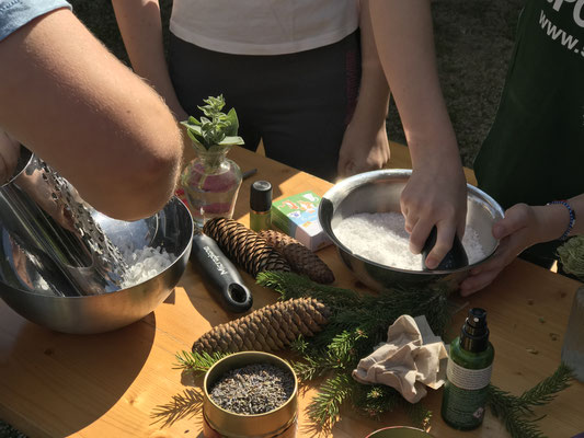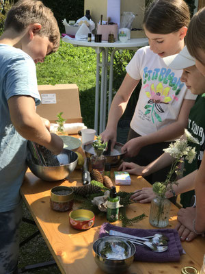 Dann wurde es praktisch … gemeinsam fertigten sie eine Salz-Mischung für ein entspannendes Fußbad an. Dafür wurde grobes Meersalz feingemörsert, um es mit weiteren Zutaten zu vermengen. Für die Herstellung der eigenen Seifenkugeln wurde Seife gehobelt und mit dem Duft der Wahl zu einer Seifenkugel geformt. Und zu guter Letzt kreierte jedes Kind noch seinen speziellen Duft-Roll-on.