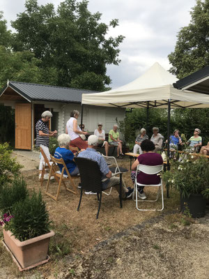 Nach der Begrüßung ging Frau Frank in einer kurzweiligen Führung mit uns quer durch den Garten und machte uns auf zahlreiche Pflanzen aufmerksam, die oft unbeachtet bleiben. Sie ließ uns an ihrem umfangreichen Wissen teilhaben und gab viele Tipps zur Verwendung der Kräuter.